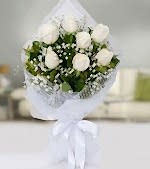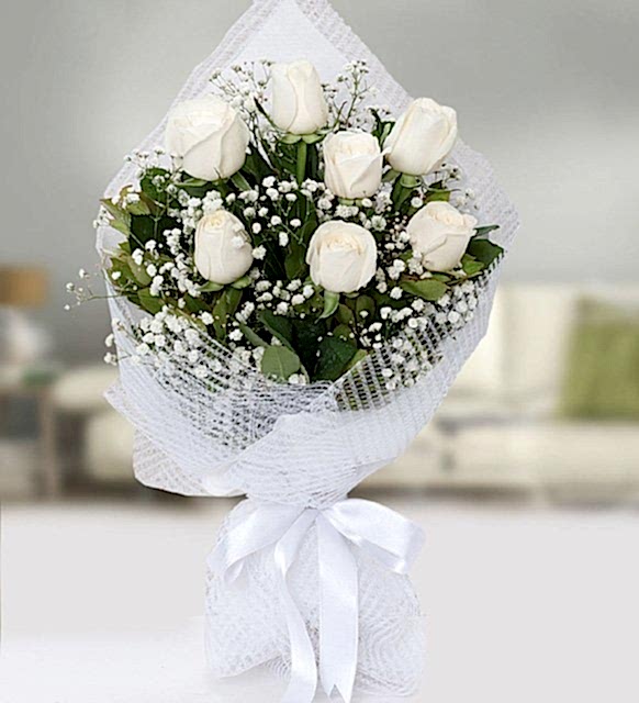 7 Adet beyaz güller ve yeşillikler ile hazırlanmış şık el buketi.