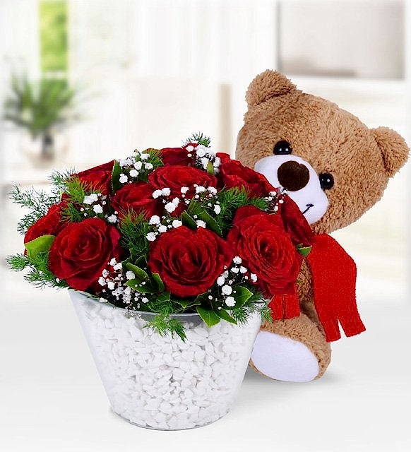 12 adet kırmızı gül, 1 adet peluş ayıcık, 5 adet cipsofilya ve yeşilliklerle hazırlanmıştır.