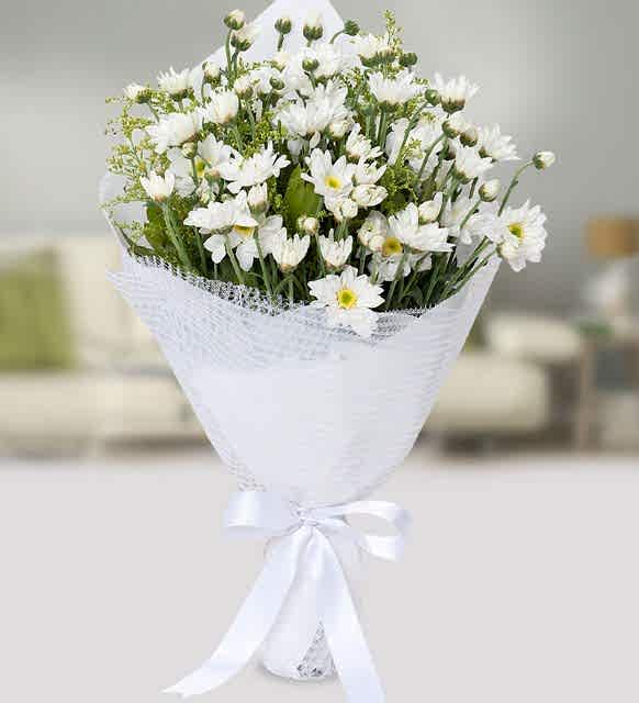 1 Demet beyaz papatyalar ve yeşillikler ile hazırlanmış kır çiçeği buketi.