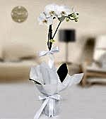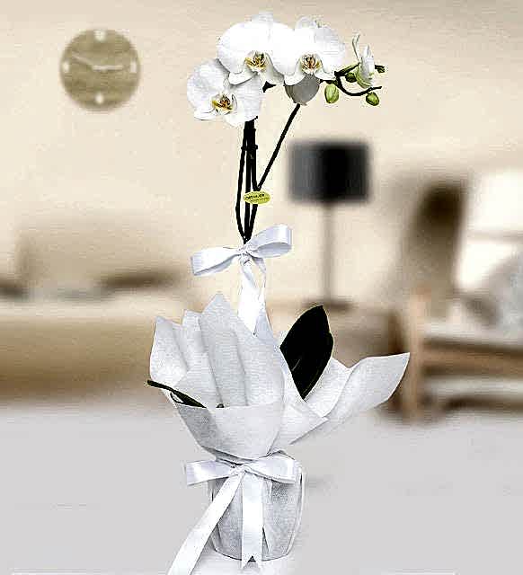 55 Cm uzunluğunda saksıda beyaz orkide.