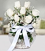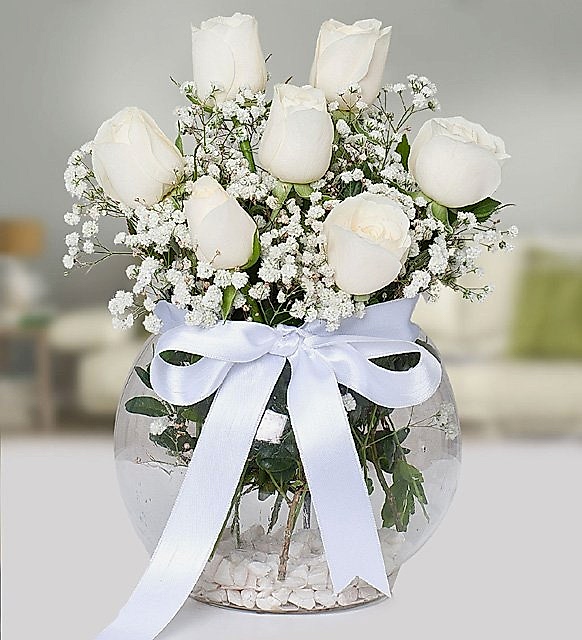 Fanus cam içerisine beyaz çakıl taşları ve 7 adet beyaz güller ile hazırlanmıştır.