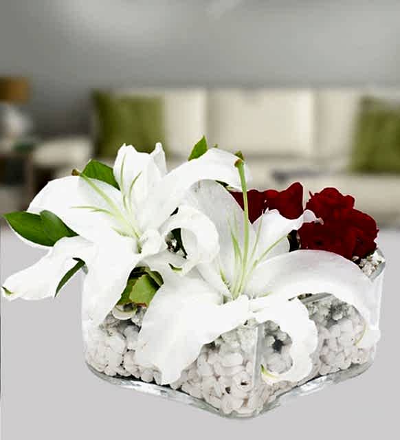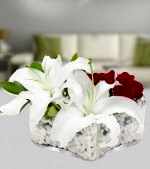 Kalp obje içerisine 5 adet kırmızı gül, 2 adet beyaz lilyum ile hazırlanmış çiçek aranjmanı.