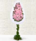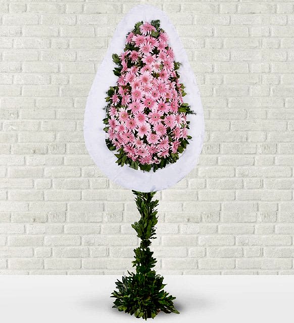 Ayaklı sepet içinde pembe gelbera ile hazırlanmış düğün çiçeği.