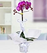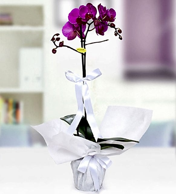 Saksı içerisinde 55 cm yüksekliğindeki topraklı mor orkide.
