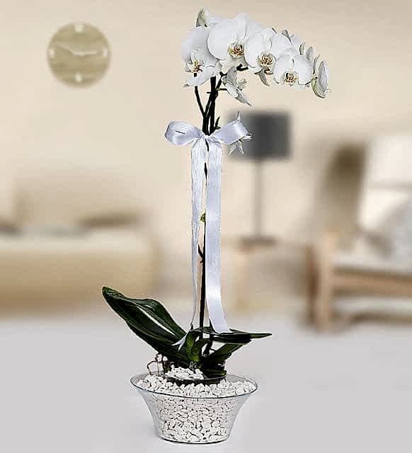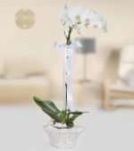 Cam içerisine 65 Cm uzunluğunda beyaz orkide ile hazırlanmıştır.