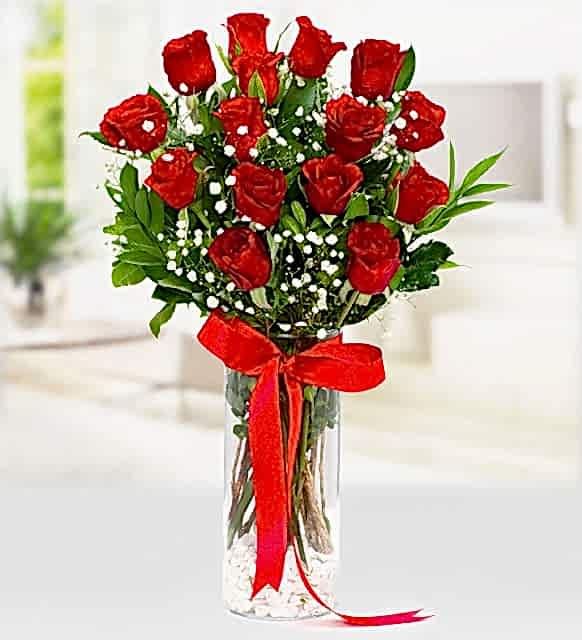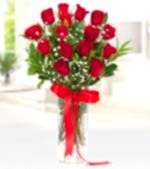 Cam vazo içerisinde 15 adet butik kırmızı güller ve renkli taşlarla hazırlanmış şık çiçek aranjmanı.